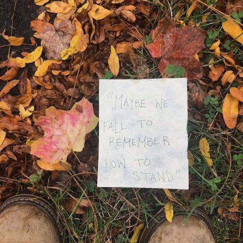 The fields are now seas of bowing goldenrod, ebbing and flowing with the tidal surge and graze of autumn wind. I watch as they dip and dive, offering to the earth the last rays of summer sun. I listen to the leaves as they sing in percussive praise of their homecoming. They twirl, float and dance their way down to the sidewalk in yellow petals, crimson stars and honey fronds. They remember the sweet hug of the earth. My feet remember them.
